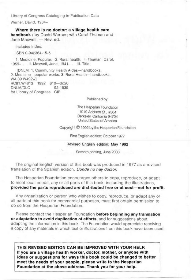 Read free. Where There Is No Doctor, by David Werner, 1992.